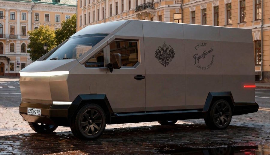 А дизайн фургона выполнен в стилистке американского электрического пикапа Tesla Cybertruck: рубленые формы кузова, плоские панели, острые углы, узкая полоска фар. Несущий кузов выполнен из некрашеной «нержавейки». Как выяснил канал «Автопоток», панели свариваются вручную из стального проката, без штампов.