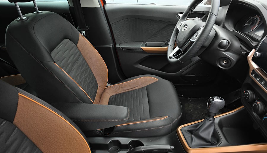 Посадка в «Ладе Искре» сама по себе довольно удобная, опять же, значительно лучше, чем в «Гранте» и немного приятнее, чем во многих бюджетных «китайцах», но есть нюанс. Подушка довольно близка к горизонтали, из-за чего бёдра при нормальной регулировке положения руля и спинки (чтобы запястье доставало до обода) немного висят в воздухе. В «Весте» с этим лучше. Регулировки поясничного упора нет, но профиль спинки неплохой и без этого, спина не проваливается. Но сама регулировка сиденья по длине немного непривычна. Даже «Гранта» приучила, что при поднятии фиксатора сиденье начинает легко скользить вперед-назад. А здесь приходится прямо двигать кресло с заметным усилием, что напоминает скорее «Приору». А ещё сиденье почему-то люфтит, и, судя по другим материалам в интернете, это не единичный случай. Кроме того, имейте в виду, что на первых двух комплектациях «Искры» руль по вылету не регулируется. Да, как на «Гранте».