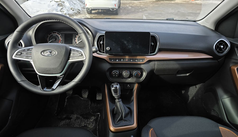 Обратная сторона — затруднённая посадка-высадка (проём по ощущениям низковат) и неважная обзорность. Причём это касается не только передних стоек, но и средних. При опускании сиденья и регулировке его и руля под себя взгляд влево (например, когда надо уступить дорогу при въезде на главную) натыкается на широченную стойку вместо окна. Приходится подаваться вперед. Через внутреннее зеркало видно приемлемый по нынешним временам сектор. К наружным зеркалам вообще ноль претензий: они от верхней комплектации «Весты», очень приличного размера.