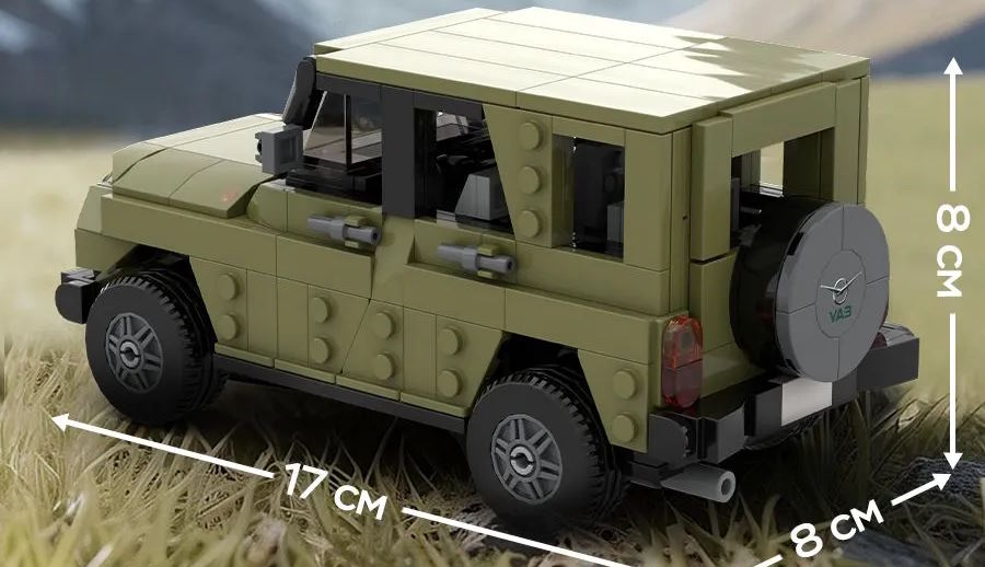 Машина цвета хаки состоит из 505 деталей, длина автомобиля в собранном виде составляет 17 сантиметров. Также уточняется, что у модели внедорожника есть подвиджные детали.